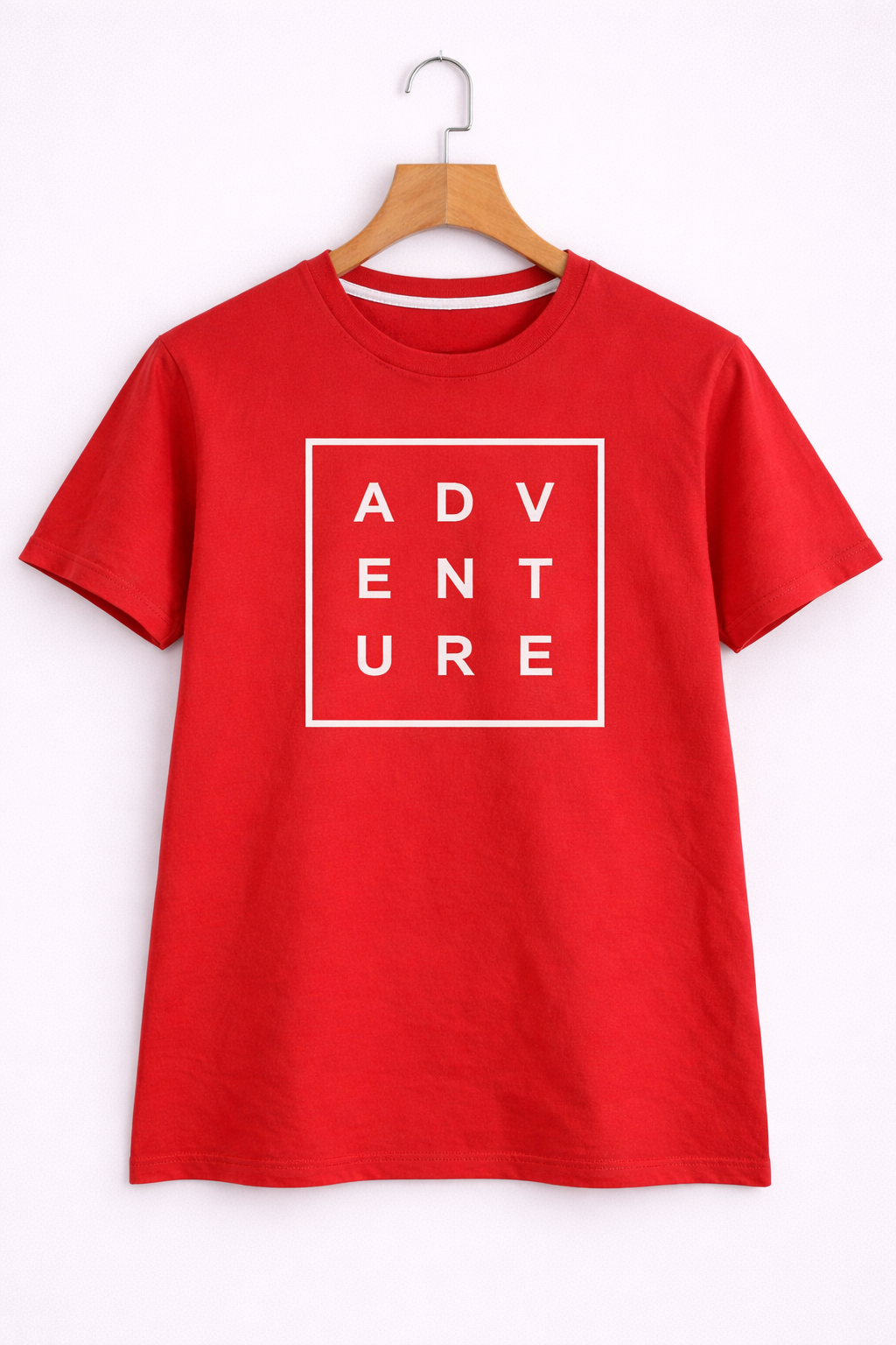 Add a bold and energetic touch to your casual wardrobe with this Adventure Graphic Half Sleeve T-Shirt. Crafted from soft and breathable fabric, this t-shirt ensures all-day comfort while keeping your style on point. The vibrant red color is highlighted by a clean white square frame and the word “ADVENTURE” printed in a modern, minimal layout, making it perfect for those who love travel, exploration, and an active lifestyle.