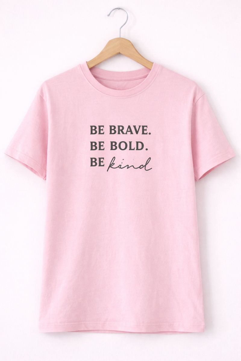 Spread positivity and confidence with the Be Brave Be Bold Be Kind T-Shirt. Made from soft and breathable fabric, this light pink T-shirt features an inspiring quote print that adds a meaningful and stylish touch to your everyday look. Designed for comfort, it offers a regular fit that’s perfect for casual outings, daily wear, or relaxed days. Easy to style with jeans, trousers, or skirts, this tee is a great choice for those who love simple fashion with a positive message