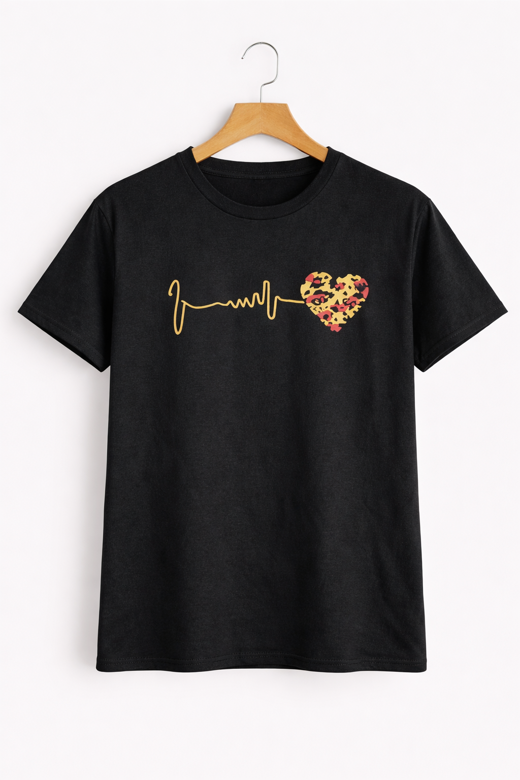 Add a creative and stylish touch to your wardrobe with this women’s black half sleeve T-shirt featuring a unique heartbeat line connected to a leopard print heart design. Made from soft, breathable fabric, this T-shirt ensures comfort throughout the day. The classic round neck and regular fit make it perfect for casual wear, outings, or everyday styling. Easy to pair with jeans, shorts, or skirts, this T-shirt is ideal for those who love trendy and expressive fashion.