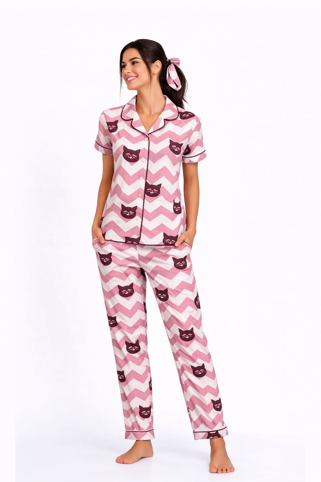 Premium Night Suit Set for Women crafted in soft breathable cotton fabric designed for all night comfort and relaxed fit Shirt comes with elegant lapel collar front button closure contrast piping detailing and half sleeves Paired with matching straight fit pajama with elastic waistband for easy comfort Cute all over print adds a playful and stylish touch Perfect for daily nightwear lounging and cozy evenings High quality stitching smooth finish and skin friendly fabric available in multiple sizes Ideal for gifting and everyday comfort wear