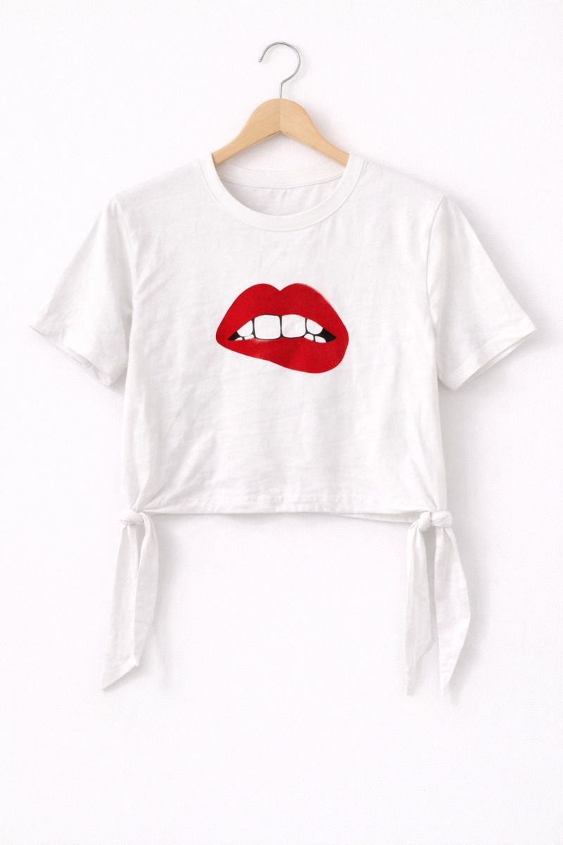 This lips print tie-up crop top is designed to make a bold style statement. Featuring a cropped length with adjustable side tie-ups, it offers a flattering and customizable fit. Made from soft, breathable fabric, it ensures comfort while keeping the look playful and modern. Perfect for casual outings, street-style looks, or pairing with high-waist bottoms, this crop top adds a fun edge to everyday wear.