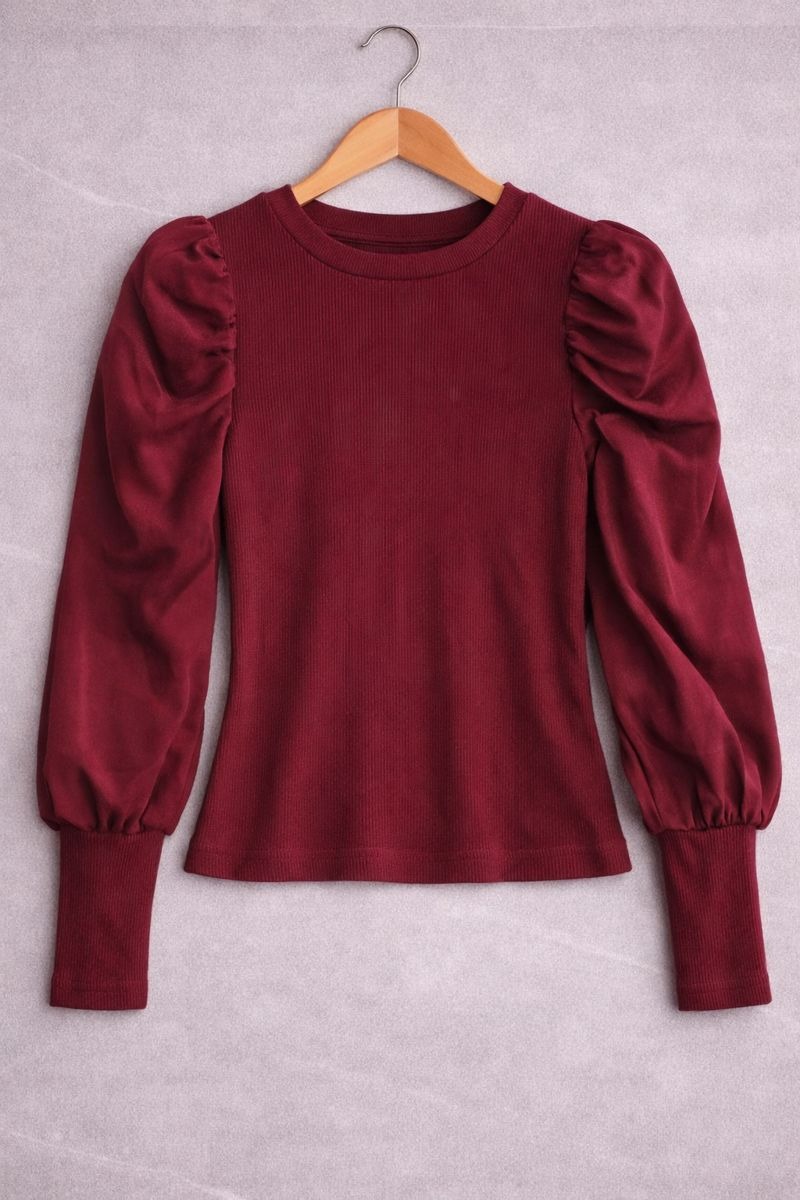 This stylish burgundy ribbed top features elegant puff sleeves that add a chic and feminine touch to your look. Made from soft, stretchable ribbed fabric, it offers a comfortable fit while enhancing your silhouette. The fitted body with voluminous sleeves makes it perfect for both casual outings and dressy occasions. Pair it with jeans, skirts, or trousers for an effortlessly trendy outfit.