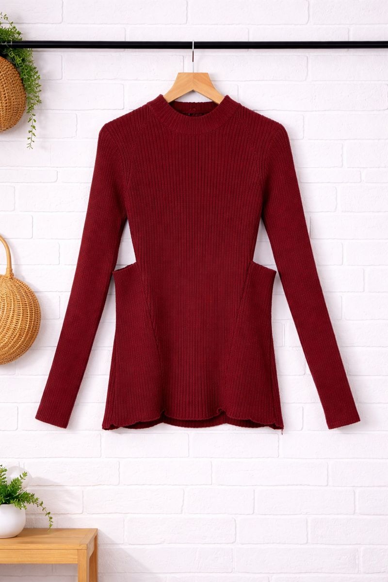 Upgrade your wardrobe with this burgundy ribbed cut-out top, designed to add a modern edge to your everyday style. Made from soft, stretchable ribbed knit fabric, it offers a comfortable yet flattering fit. The long sleeves and high neckline give it a sleek look, while the waist cut-out detailing creates a stylish silhouette. Easy to pair with jeans, skirts, or trousers, this top is perfect for casual outings, evening looks, or statement styling.