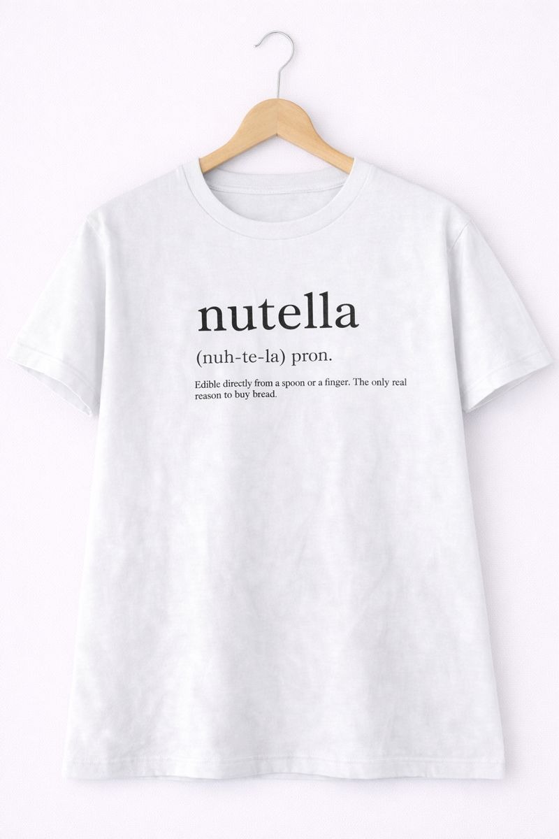 Add a fun and quirky touch to your casual style with this typography graphic t-shirt. Designed with a playful definition-style quote inspired by a popular chocolate spread, this tee is perfect for food lovers with a sense of humor. Made from soft, breathable fabric, it offers comfortable all-day wear and a relaxed fit. Easy to style with jeans, shorts, or joggers, this t-shirt is ideal for casual outings, lounging, or everyday wear.