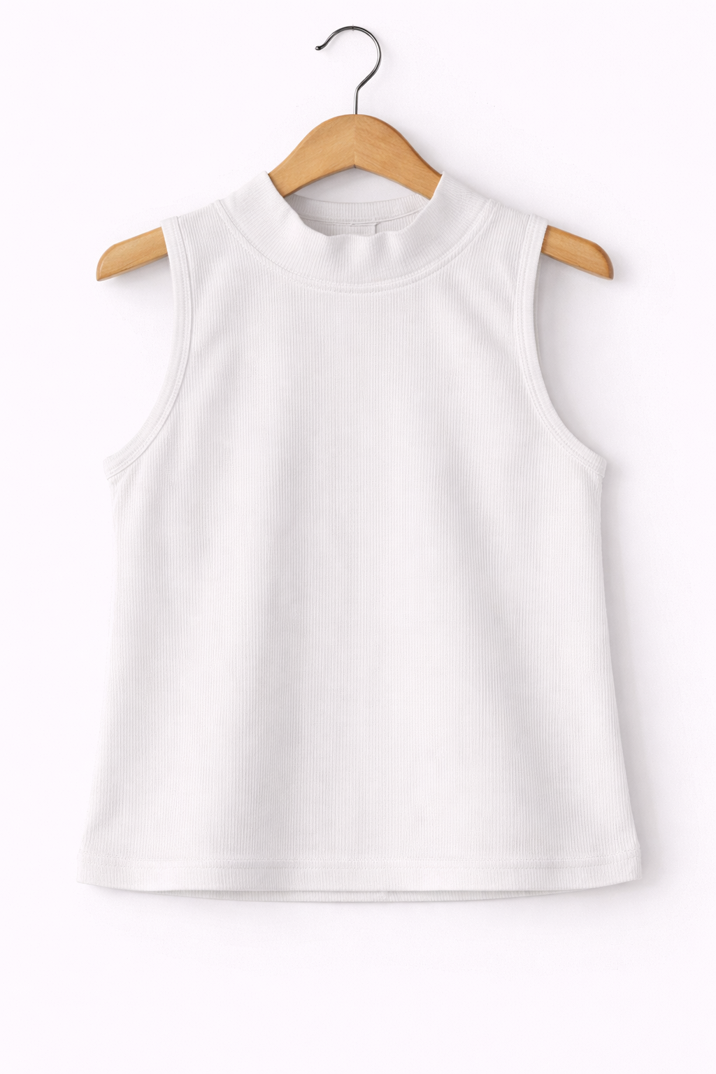 This classic white ribbed sleeveless top features a clean, minimal design with a stylish mock neckline. Made from soft, stretchable ribbed fabric, it offers a comfortable and flattering fit for everyday wear. The lightweight material makes it perfect for layering or wearing on its own during warm weather. Easy to style with jeans, skirts, or trousers, this versatile top is an essential addition to any modern wardrobe.