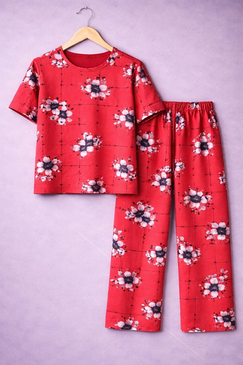 This Red Floral Full Print Nightwear Set comes with a half-sleeve t-shirt and matching full-length pants, designed with an elegant all-over floral print. Made from soft and breathable fabric, it provides a relaxed fit and lasting comfort. Perfect for night wear, lounging at home, or daily relaxed wear, this set combines style with everyday ease.