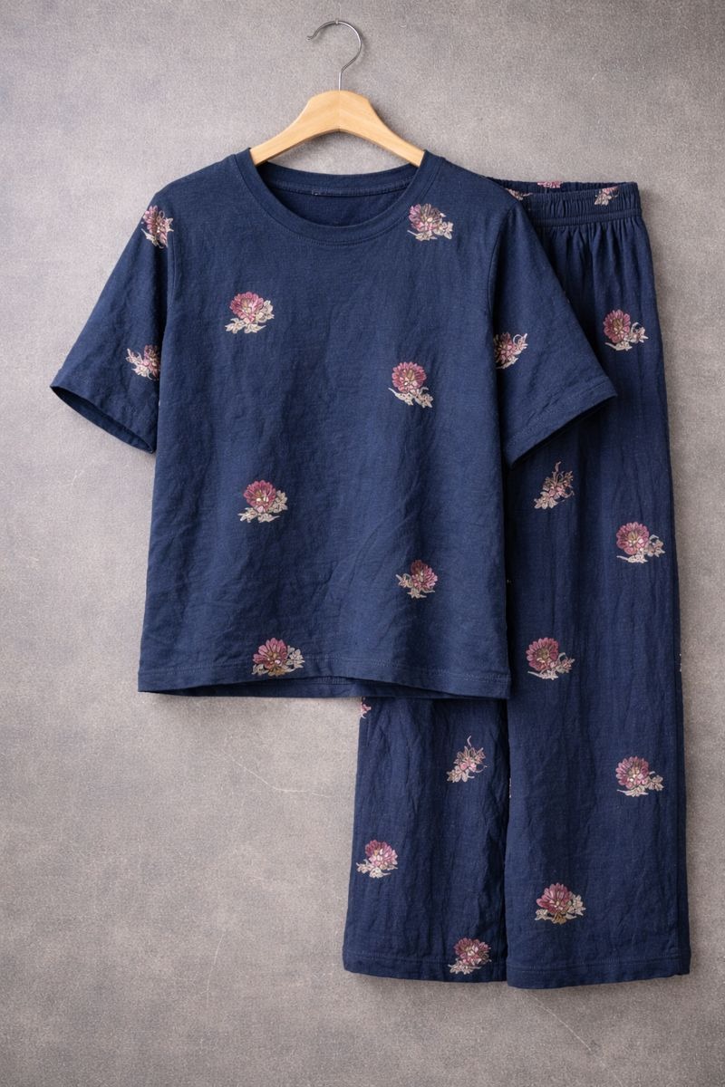This comfortable co-ord set features a navy blue half-sleeve t-shirt paired with matching printed pants, both adorned with delicate floral motifs for a soft and elegant look. Made from lightweight, breathable cotton fabric, it offers all-day comfort and a relaxed fit. Perfect for lounging, daily wear, or casual outings, this versatile set combines style and ease, making it an ideal choice for both home and outdoor wear.