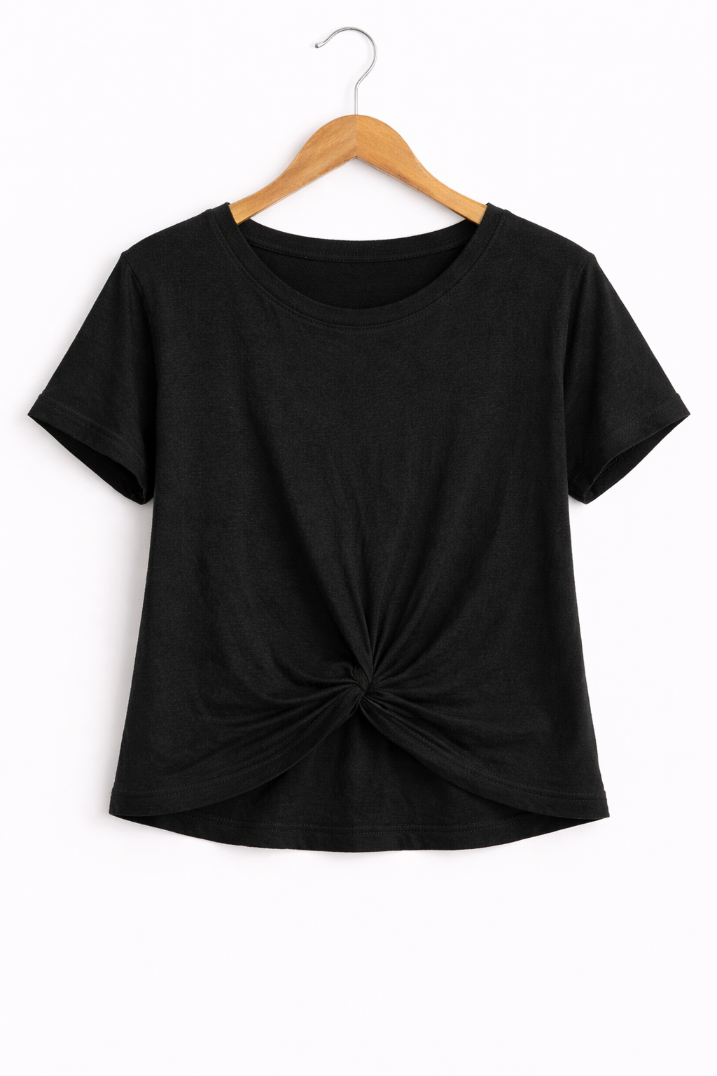 This stylish black half-sleeve T-shirt features a trendy front twist knot design that adds a modern touch to a classic silhouette. Made from soft and breathable fabric, it offers all-day comfort with a flattering fit. Perfect for casual outings, pairing effortlessly with jeans, skirts, or shorts. The minimalist look makes it a versatile wardrobe essential for everyday wear.