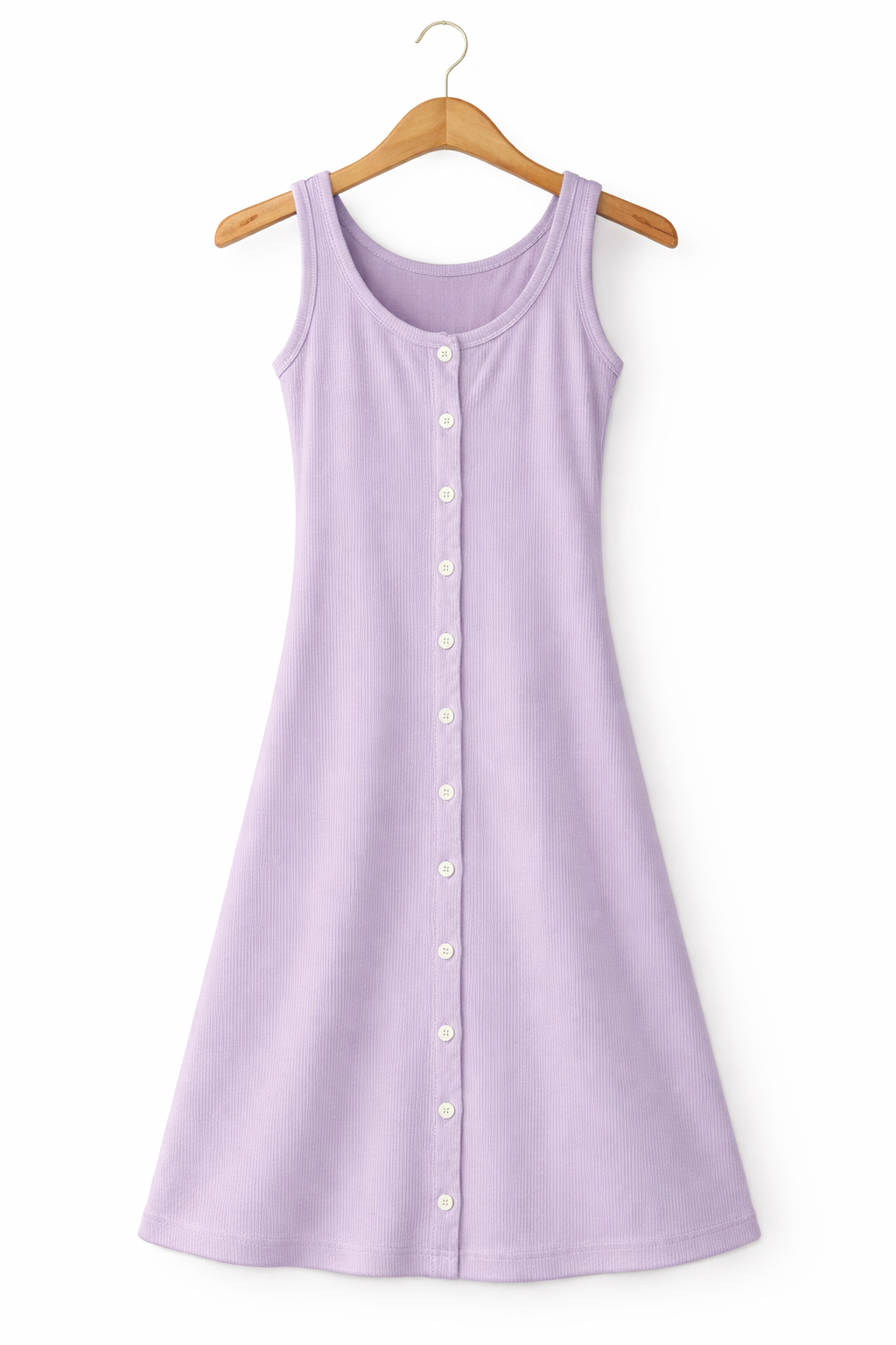 This sleeveless lavender ribbed dress features a clean and feminine design with a scoop neckline and a stylish button-down front. Made from soft, breathable, and stretchable fabric, it ensures a comfortable fit throughout the day. The straight silhouette with a gentle flare at the hem makes it perfect for casual outings, daily wear, or relaxed summer styling. Easy to pair with sandals, flats, or light accessories, this dress adds effortless charm to your everyday wardrobe.
