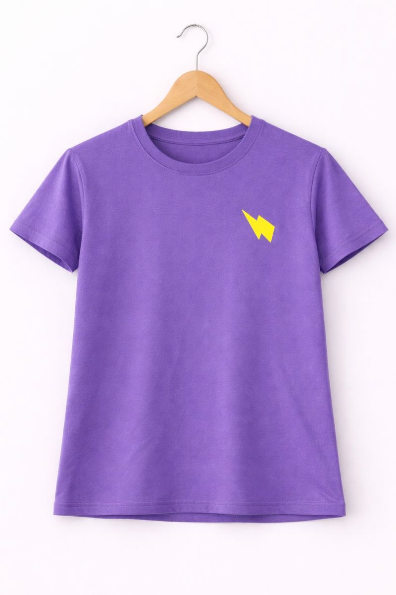 Add a spark of style to your everyday look with this purple lightning bolt graphic T-shirt. Featuring a minimal yet bold thunder print, this tee brings a cool and energetic vibe to casual wear. Made from soft, breathable fabric, it offers a comfortable fit that’s perfect for all-day use. Easy to pair with jeans, cargos, or shorts, this T-shirt is ideal for relaxed outings and daily styling.