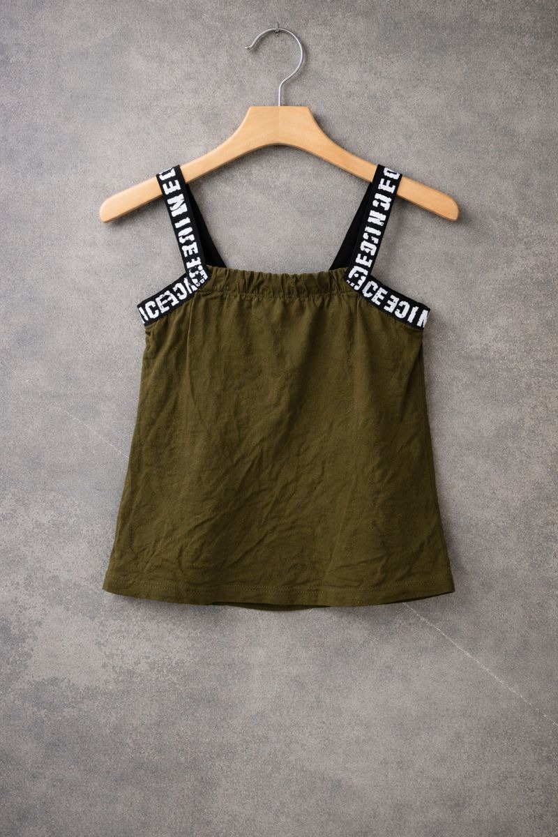 This stylish sleeveless top comes in a solid olive green shade with bold logo-printed shoulder straps for a modern, sporty look. Crafted from soft and breathable fabric, it features a comfortable fit and a clean, minimal silhouette. Perfect for casual outings, lounging, or pairing with jeans, shorts, or joggers, this top adds an effortless street-style vibe to your everyday wardrobe.