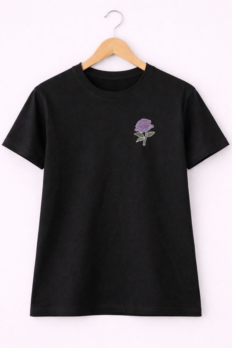 Add a touch of elegance to your everyday style with this Midnight Rose Embroidered T-Shirt. Crafted from soft, breathable fabric, this black t-shirt features a minimal purple rose embroidery on the chest, giving it a classy yet modern look. Perfect for casual outings, daily wear, or pairing with jeans and shorts for effortless style. Comfortable fit and timeless design make it a must-have in your wardrobe.
