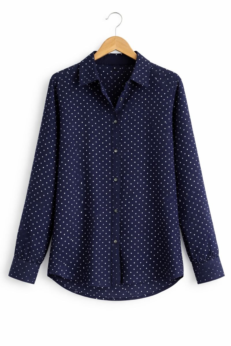 This navy blue polka dot shirt is designed for effortless everyday elegance. Made from soft and lightweight fabric, it features a classic button-down front with full sleeves and a smart collar. The subtle white polka dot print adds a timeless and stylish touch, making it perfect for both casual and semi-formal looks. Easy to pair with jeans, trousers, or skirts, this shirt is a versatile wardrobe essential.