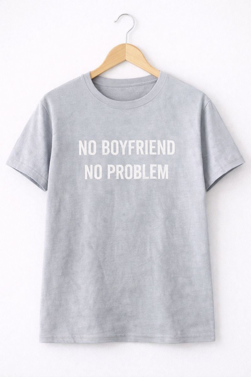 Make a confident statement with this light grey graphic T-shirt featuring the bold text “NO BOYFRIEND NO PROBLEM.” Designed for those who own their independence with style, this tee combines comfort with attitude. Crafted from soft, breathable fabric, it ensures a relaxed fit for all-day wear. Easy to pair with jeans, shorts, or joggers, this T-shirt is perfect for casual outings, daily wear, or laid-back weekends. Simple, bold, and empowering—this tee lets your mindset do the talking.