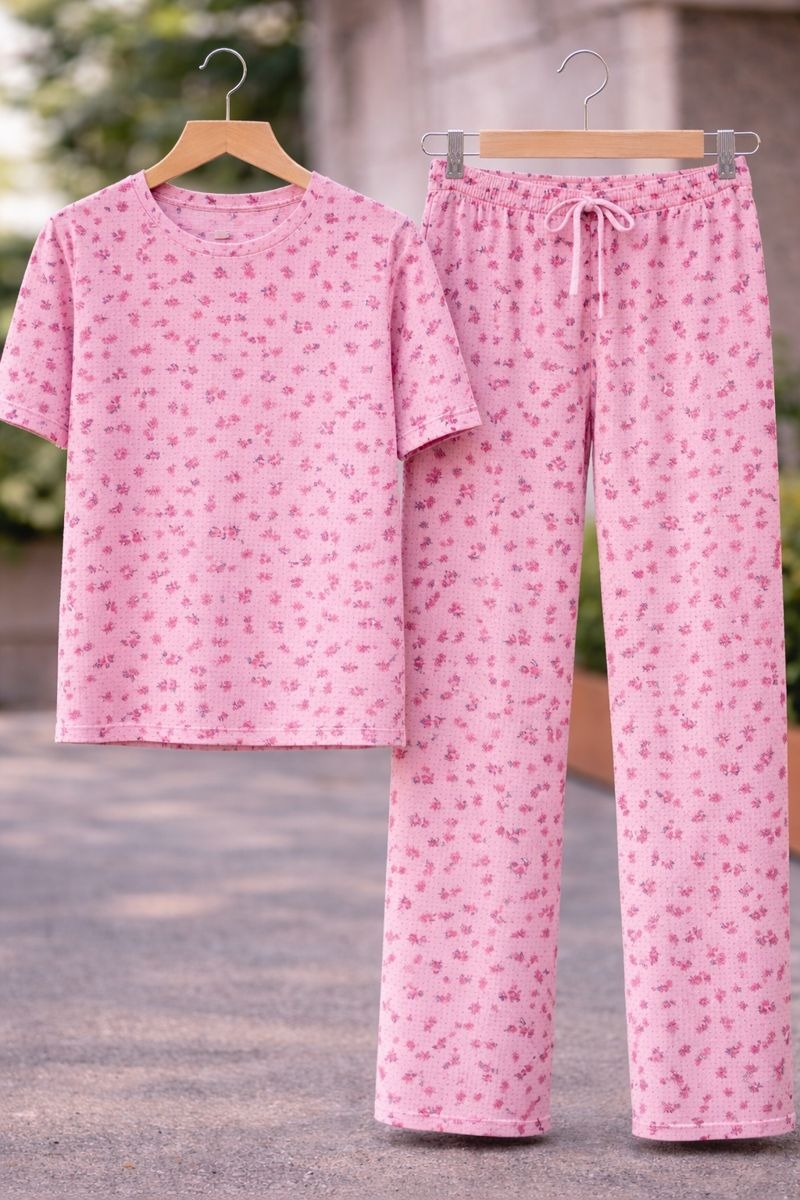 Unwind in comfort with the Pink Blossom Lounge Co-Ord Set, featuring a full-sleeve printed t-shirt paired with matching full-length lounge pants. Made from soft, breathable fabric, this set is designed to keep you comfortable all day and night. The delicate floral print on a soothing pink base adds a fresh and feminine touch. The t-shirt offers a relaxed fit, while the pants come with an elasticated waistband and adjustable drawstring for easy wear. Perfect for lounging, sleepwear, or relaxed days at home, this co-ord set blends comfort with effortless style.