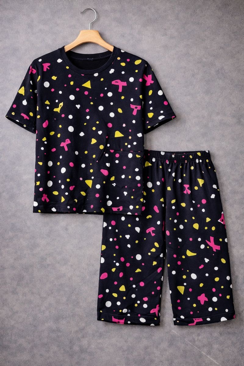 This stylish nightwear co-ord set features a half-sleeve t-shirt paired with matching half pants, designed in a black base with vibrant multicolor polka dots and bow prints. Made from soft, lightweight, and breathable fabric, it provides a relaxed fit for maximum comfort. Perfect for sleeping, lounging at home, or casual daily wear, this set blends playful design with everyday ease.