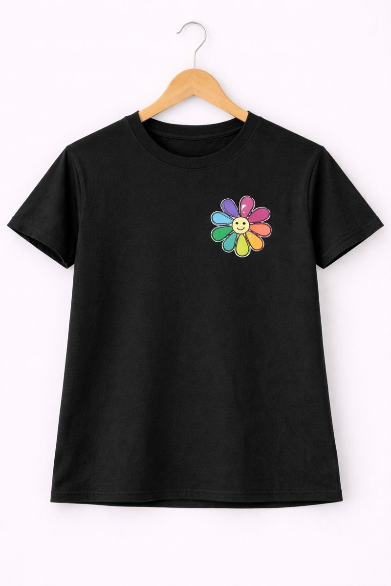 Brighten up your casual look with this black rainbow flower graphic T-shirt. Featuring a cheerful multicolor flower design, this tee adds a fun and positive vibe to your everyday style. Made from soft and breathable fabric, it offers a comfortable fit that’s perfect for all-day wear. Easy to pair with jeans, skirts, or shorts, this T-shirt is ideal for casual outings and relaxed days.