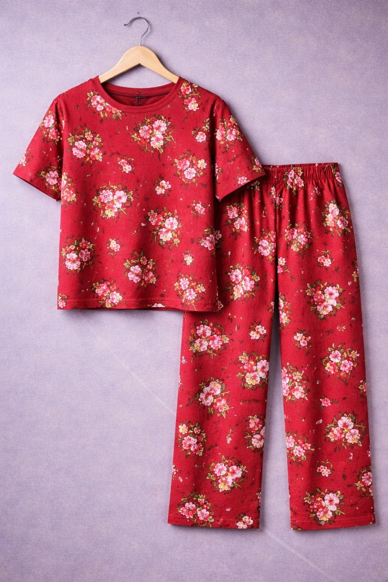 This elegant nightwear co-ord set features a half-sleeve t-shirt paired with matching full-length pants, designed in a rich red base with beautiful floral prints. Made from soft, breathable fabric, it offers a relaxed and comfortable fit for all-day ease. Perfect for sleeping, lounging at home, or relaxed daily wear, this set blends feminine charm with everyday comfort.