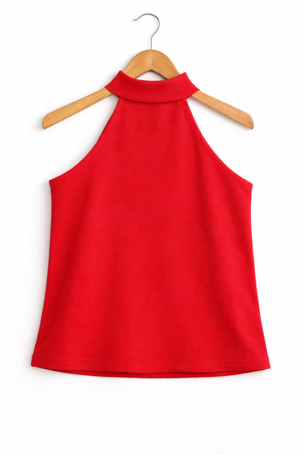 Elevate your fashion game with this stylish red ribbed halter neck top. Designed with a modern choker-style high neckline, this sleeveless top offers a sleek and flattering silhouette. Made from soft, stretchable ribbed fabric, it ensures a comfortable fit while enhancing your look. The bold red color adds a confident and trendy touch, making it perfect for parties, casual outings, or evening wear. Pair it effortlessly with jeans, skirts, or trousers for a chic and fashionable outfit.