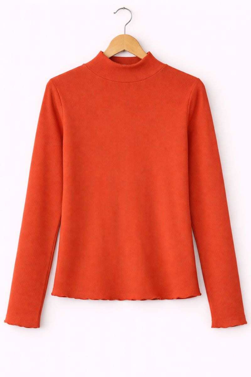 Add a bold touch to your everyday wardrobe with this rust orange high-neck ribbed top. Designed with a soft, stretchable fabric, it offers a comfortable fit while enhancing your silhouette. The long sleeves and high neckline make it perfect for layering or wearing on its own. Ideal for casual outings, office wear, or evening styling, this versatile top pairs effortlessly with jeans, trousers, or skirts for a clean and modern look.