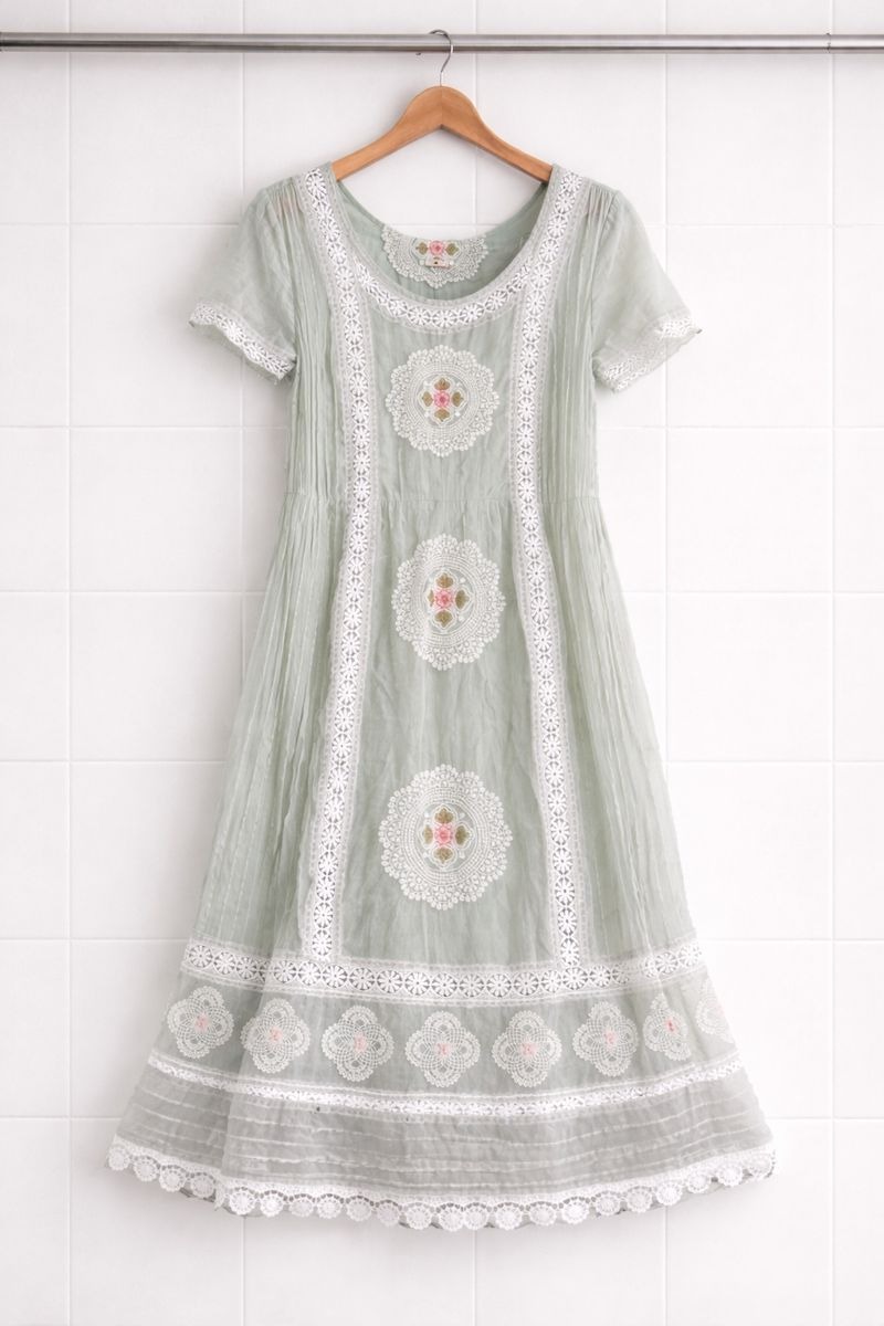 This elegant sage green midi dress is designed to bring a soft and graceful charm to your wardrobe. Made from lightweight, semi-sheer fabric, it features intricate white lace detailing and delicate floral embroidery that adds a refined, feminine touch. The comfortable A-line silhouette flows beautifully, while the short sleeves and rounded neckline make it perfect for day outings, festive gatherings, or casual occasions. Style it with minimal accessories and flats or heels for a fresh, elegant look.