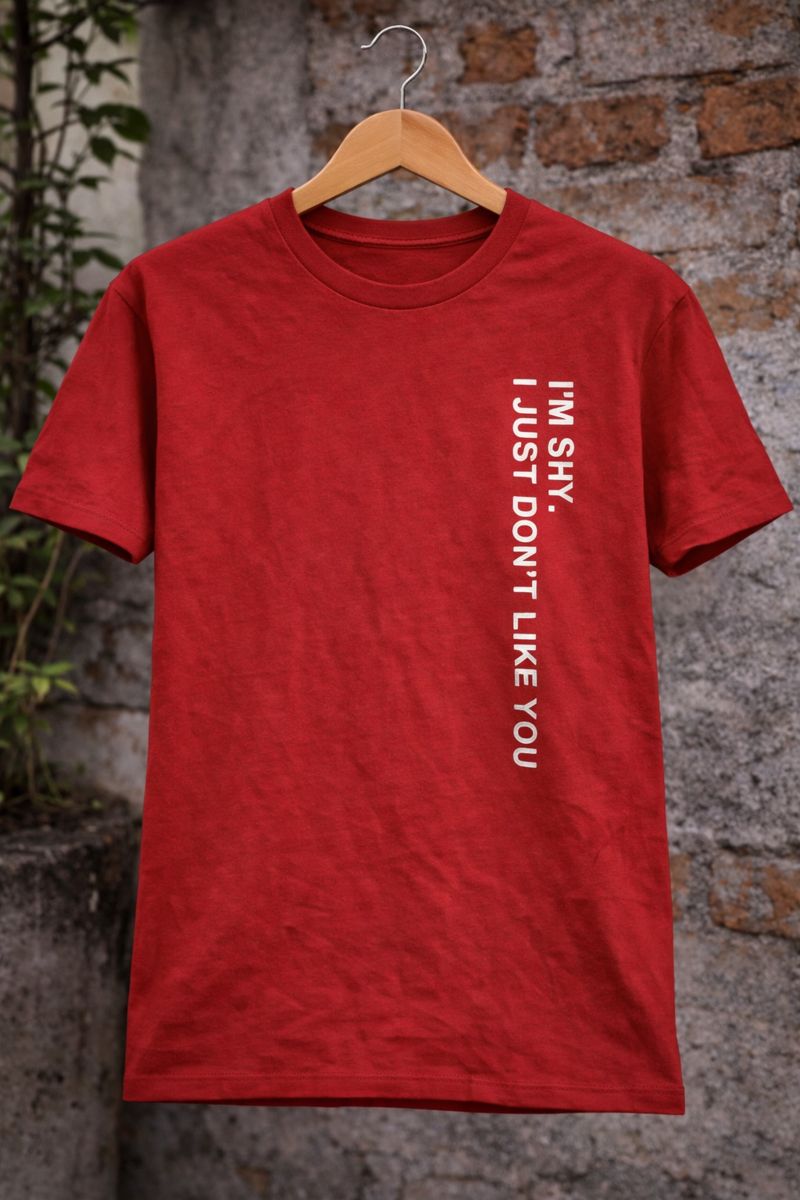 Make a bold statement with this red T-shirt featuring the edgy quote “I’m shy, I just don’t like you” printed in a clean vertical design. Made from soft and breathable cotton fabric, this T-shirt offers a comfortable fit for everyday wear. The confident, attitude-filled text adds a modern street-style vibe, making it perfect for casual outings, college wear, or daily styling. Pair it with jeans or cargos for an effortless, standout look.