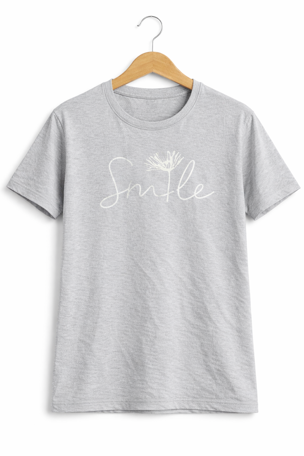 Refresh your everyday style with this elegant half-sleeve T-shirt designed for comfort and simplicity. Made from soft and breathable cotton fabric, it feels light and smooth on the skin. The T-shirt features a beautiful “Smile” text print with a delicate floral/dandelion design, creating a calm, positive, and minimalist look. With a classic round neck and regular fit, it is perfect for daily wear, casual outings, office casuals, or relaxed weekends. Easy to pair with jeans, trousers, or skirts for a clean and graceful outfit.