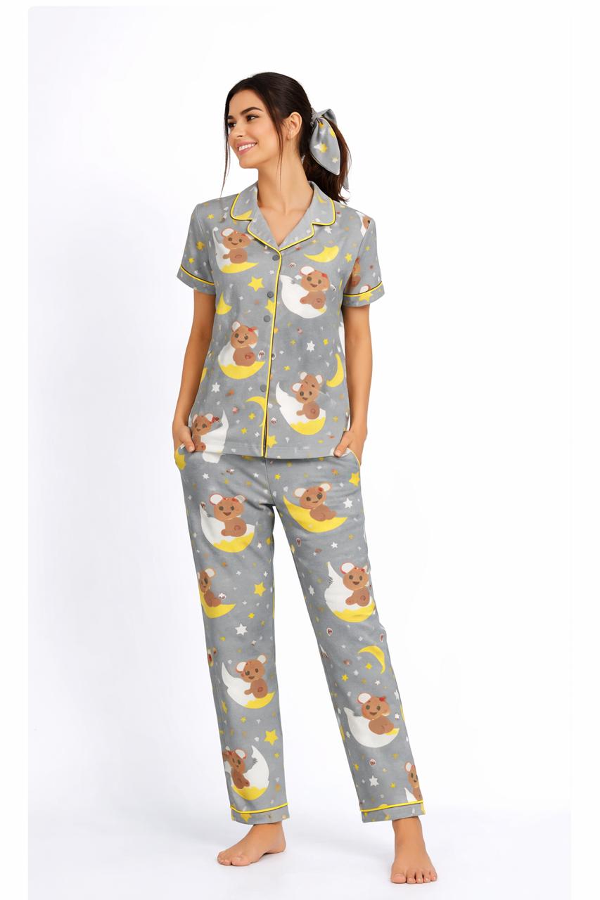Premium Night Suit Set for Women crafted in soft breathable cotton fabric designed for all night comfort and relaxed fit Shirt comes with elegant lapel collar front button closure contrast piping detailing and half sleeves Paired with matching straight fit pajama with elastic waistband for easy comfort Cute all over print adds a playful and stylish touch Perfect for daily nightwear lounging and cozy evenings High quality stitching smooth finish and skin friendly fabric available in multiple sizes Ideal for gifting and everyday comfort wear