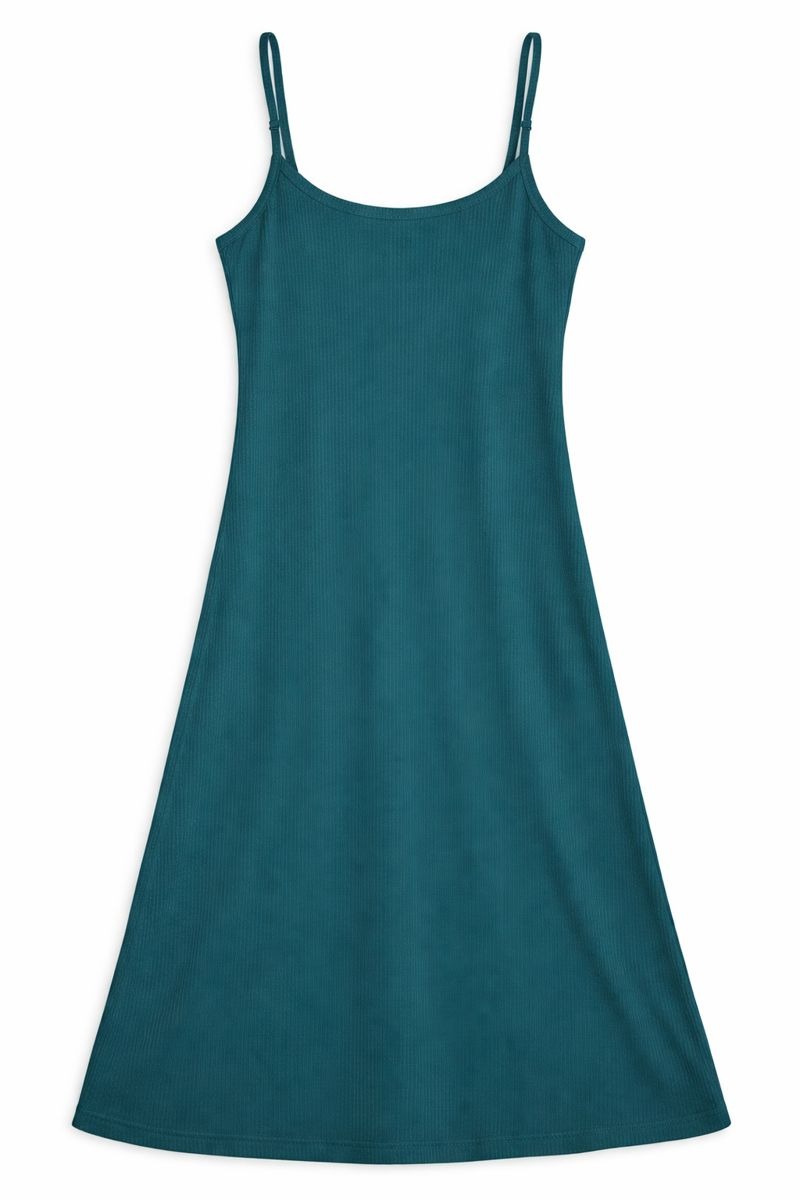 This teal ribbed spaghetti strap dress is designed for effortless everyday comfort with a clean, minimal silhouette. Made from soft and stretchable ribbed fabric, it offers a smooth fit that falls naturally on the body. The sleeveless design with thin shoulder straps makes it lightweight and breathable, perfect for daily wear, casual outings, or relaxed home styling. Easy to pair with flats, sandals, or layered looks, this dress is a versatile wardrobe essential.