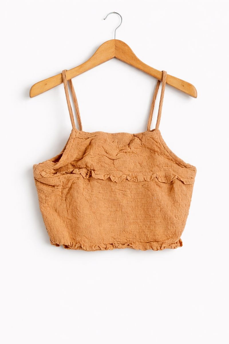Keep your look effortless and stylish with this textured smocked crop top. Crafted from soft, lightweight fabric, it features a subtle crinkled texture with a comfortable smocked finish for a flattering fit. The thin shoulder straps and cropped length make it perfect for warm-weather styling. Pair it with high-waist jeans, skirts, or shorts for a relaxed yet trendy everyday outfit.