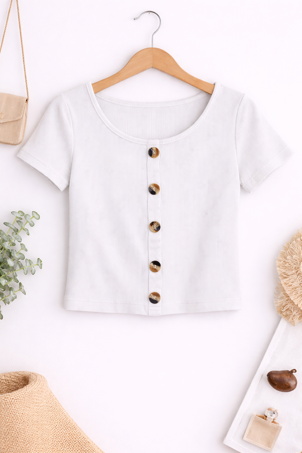 Upgrade your everyday style with this White Ribbed Button Front Crop Top. Crafted from soft, stretchable ribbed fabric, it offers a comfortable and flattering fit. The classic round neckline and short sleeves make it easy to style, while the front button detailing adds a chic, modern touch. Perfect for casual outings, pairing with jeans, skirts, or shorts, this versatile crop top is a must-have wardrobe essential for effortless fashion.